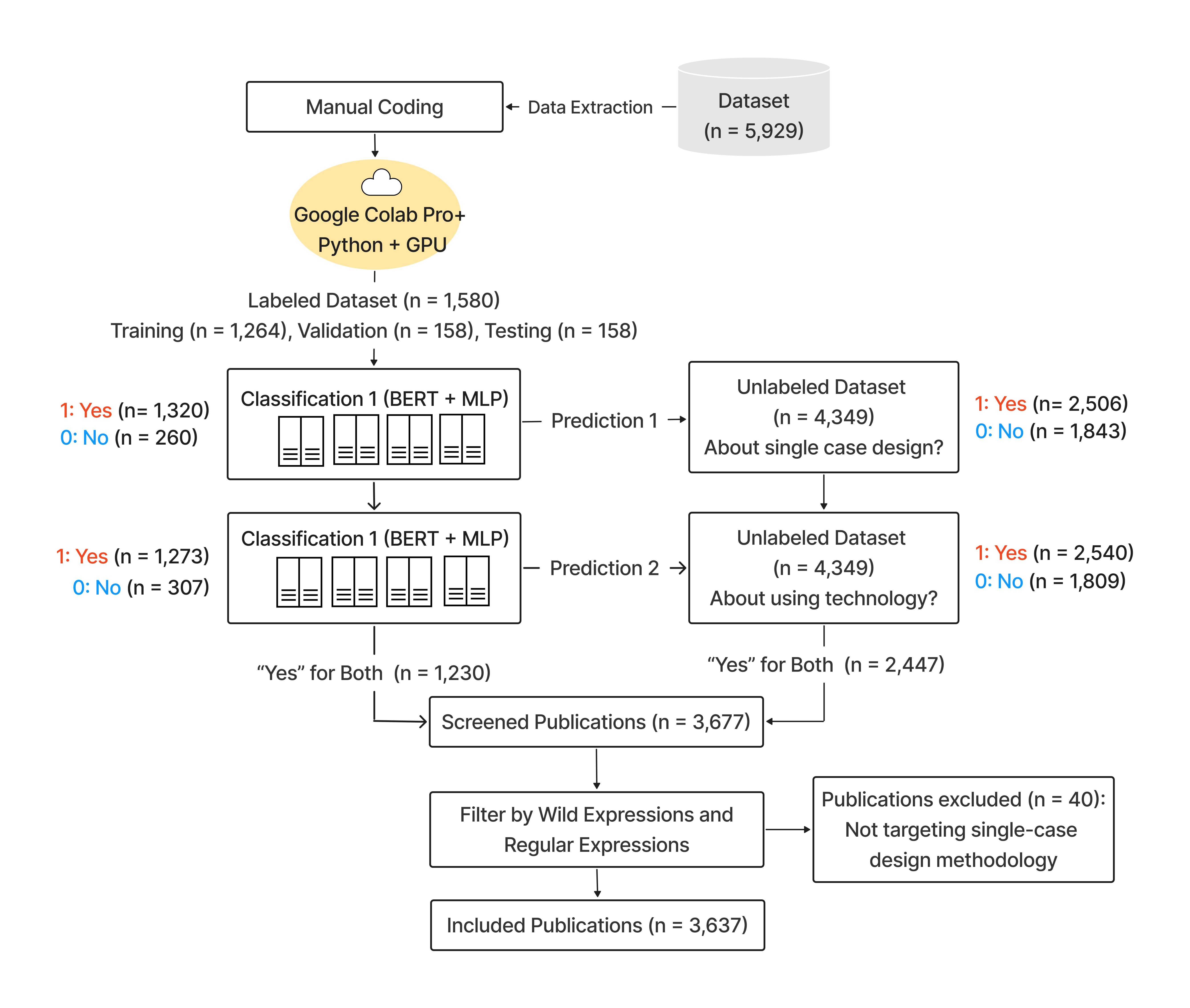 A Transformer-MLP classifier (pubmlp) combined transformer embeddings with categorical and numeric features for binary classification. The model was trained on human-labeled records and used to predict labels for unlabeled records. Classification was performed sequentially: first for single-case design, then for technology use.